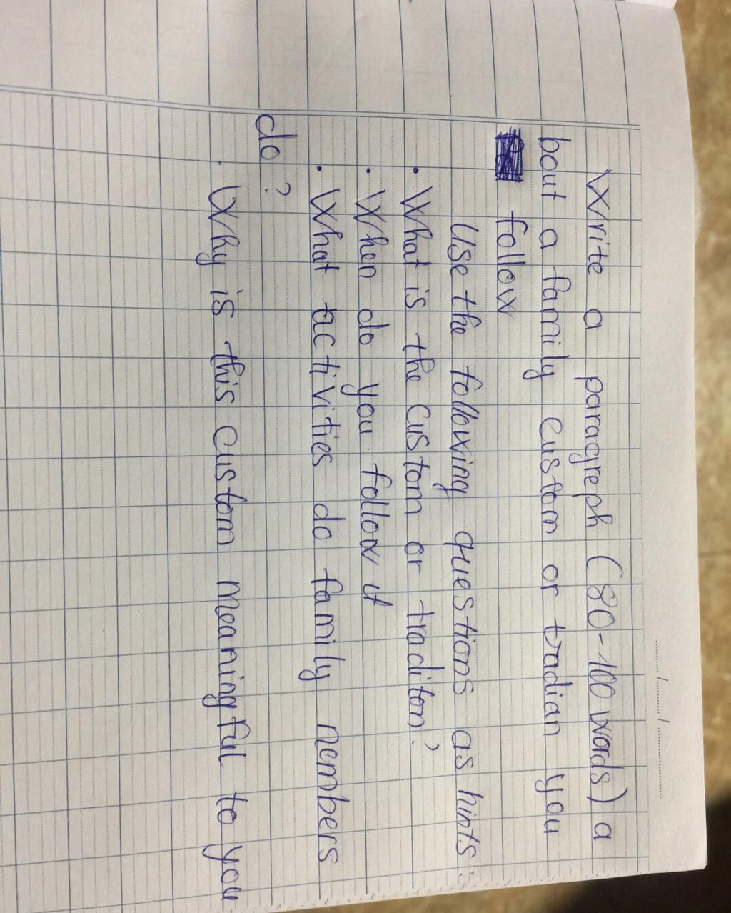 `->` One meaningful custom in my family is having a family meal together every Sunday evening. We usually follow this custom at the end of the week, after everyone finishes work or study. During the meal, family members talk about their daily activities, share stories, and encourage each other. This custom is meaningful to me because it helps us stay connected, understand one another better, and strengthen family bonds. No matter how busy we are this moment always brings warmth and happiness to my family