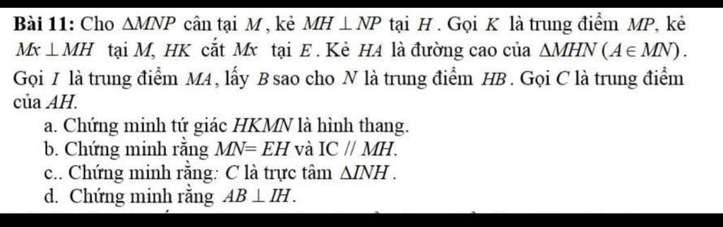 Bài 11: Cho AMNP cân tại M, kẻ MH LNP tại H . Gọi K là trung điểm MP, kẻ