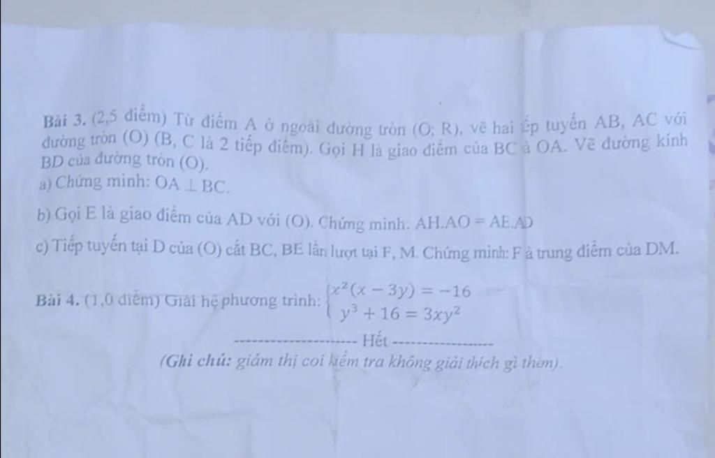 Bài 3. (2,5 điểm) Từ điểm Ạ ở ngoài đường tròn (O; R), về hai ấp tuyến AB, AC VỚI
