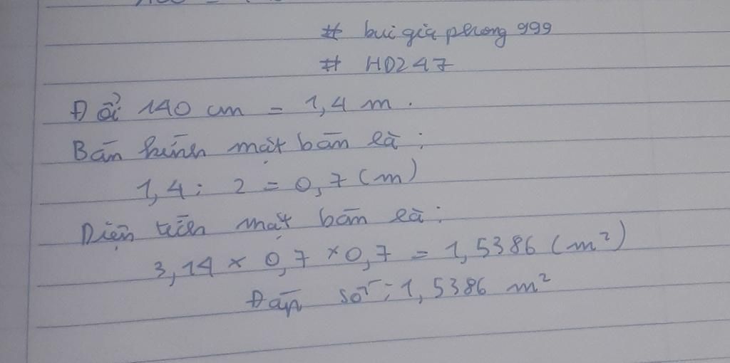 Mai đo mặt bàn ăn có dạng hình tròn đường kính dài 140 cm hỏi mặt bạn đó có diện tích là bao nhiêu mét vuông