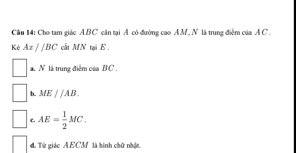`⇒ MN` // `AB` mà `N ∈ ME ⇒ ME` // `AB ⇒` đáp án b đúng
