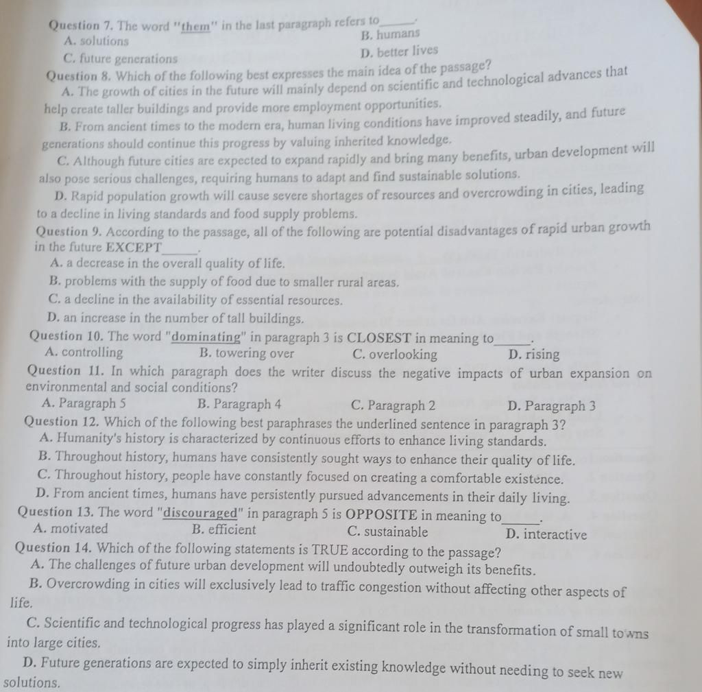 Giải thích: Đoạn văn giới thiệu sự phát triển của thành phố (lợi ích), sau đó trình bày các bất lợi (thách thức), và kết luận bằng việc con người cần thích nghi và tìm giải pháp. Lựa chọn C bao quát cả hai khía cạnh (lợi ích và thách thức của sự phát triển đô thị và nhu cầu tìm giải pháp bền vững), đây là ý chính bao quát nhất.