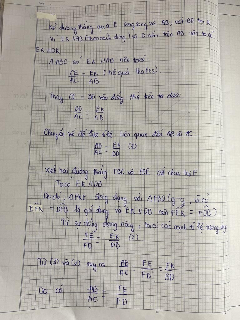 Trên hai cạnh AB, AC của △ABC lấy hai điểm D và E, sao cho BD = CE,kéo dài DE và BC cắt nhau tại F. Chứng minhAB : AC = FE : F D. giúp vs ạ