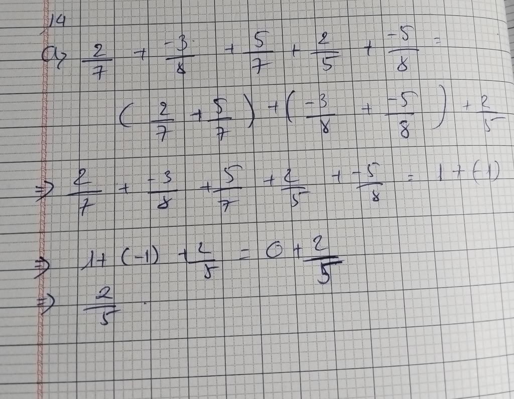 14. Tính . a) 2/7 + -3/8 + 5/7 + 2/5 + -5/8 . 26. Tìm x ∊ N biết: b) -5/8 + 3/4 + 15/-8 ≤ x ≤ -1/2 + 2 +5/2. 36. Tính hợp lí: b) -3/2 + 11/8 - 1/4 + 5/8