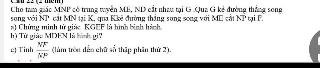 `-> (MK)/(MN)=(MG)/(ME)=2/3` (do `G` là trọng tâm của `triangle MNP`) `(4)`