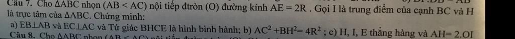 Câu 7. Cho AABC nhọn (AB < AC) nội tiếp đtròn (O) đường kính AE = 2R . Gọi I là trung điểm của cạnh BC và H