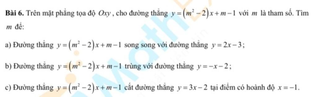 Thay `x=-1;y=-5` vào `y=(m^2-2)x+m-1`, ta có: