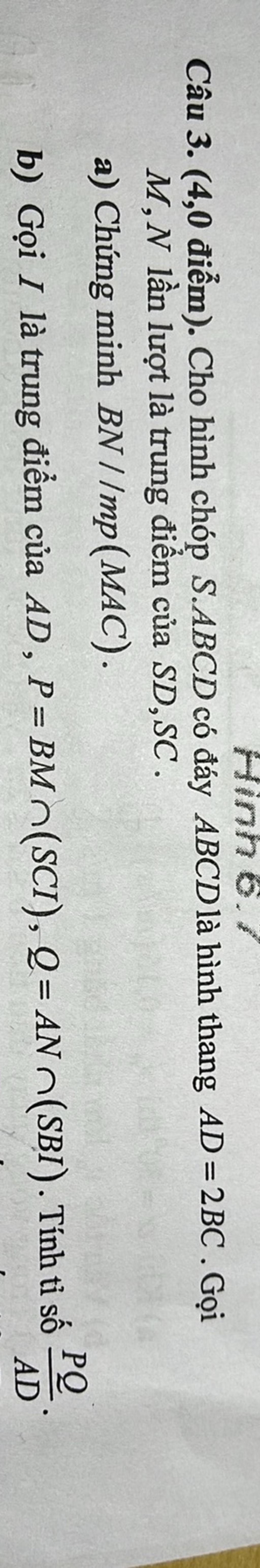 $\displaystyle \text{Thay vào } \vec{BN}: \vec{BN} = \frac{1}{2}\vec{SC} - (\vec{SC} - \frac{1}{2}\vec{AD}) = \frac{1}{2}\vec{AD} - \frac{1}{2}\vec{SC}.$