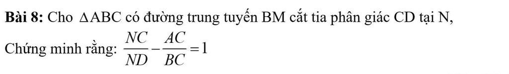 K là trung điểm của AD (MK là đường trung bình) => AK=KD BK tách thành BD+BK <=> BK= BD+AK (AK=DK) trở lại với NC/ND = 2BK/BD -1 thay BK=BD+AK => NC/ND = 2(BD+AK)/BD - 1 phá ngoặc ở tử số => NC/ND = 2BD + 2AK / BD - 1