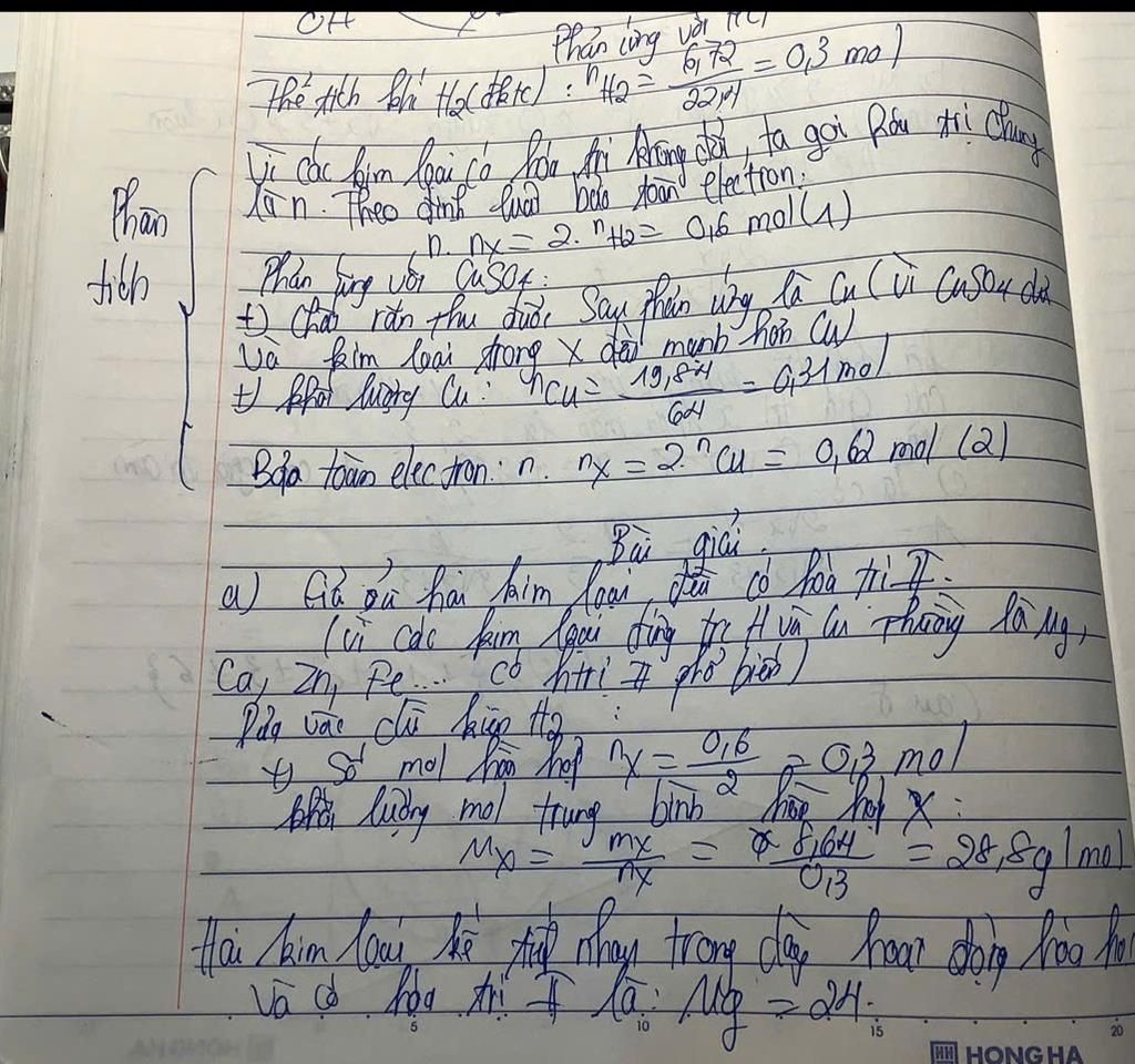 Câu 1: Cho hỗn hợp X gồm hai kim loại kế tiếp nhau trong dãy hoạt động hóa học, mỗi kim loại có hóa trị không đổi. Hòa tan hoàn toàn 8,64 g hỗn hợp X trong dung dịch HCl dư, thu được 6,72 lít khí H₂ (đktc).Cũng 8,64 g hỗn hợp X cho tác dụng với dung dịch CuSO₄ dư, sau phản ứng thu được 19,84 g chất rắn. Xác định: