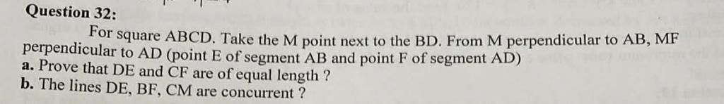 `⇒ G ∈ CN` ( `G` là trực tâm) `⇒ DE, BF, CM` đồng quy