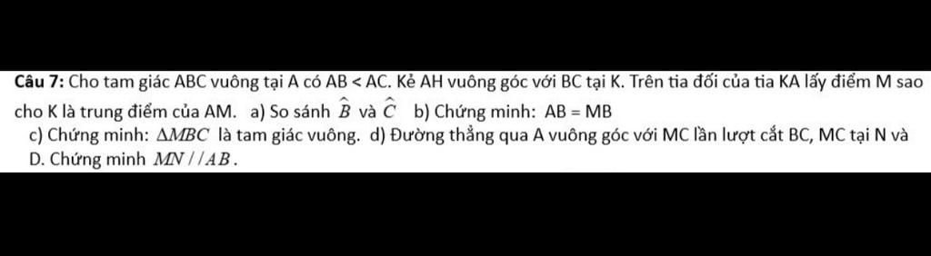 Câu 7: Cho tam giác ABC vuông tại A có AB < AC. Kẻ AH vuông góc với BC tại K. Trên tia đối của tia KA lấy điểm M sao