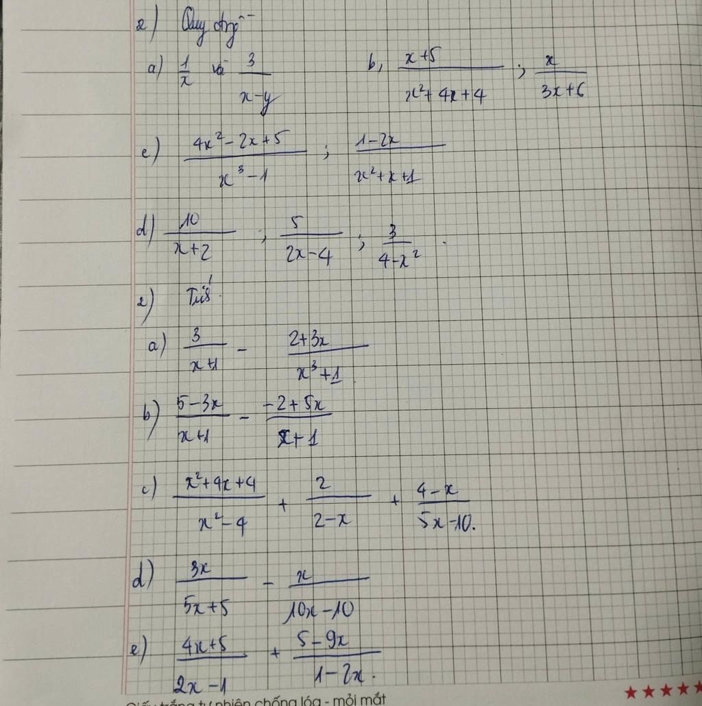 Ta có: `10/(x+2)=(10*2(x-2))/(2(x-2)(x+2)); 5/(2x-4)=(5(x+2))/(2(x-2)(x+2)); 3/(4-x^2)=((-3)*2)/(2(x-2)(x+2))`