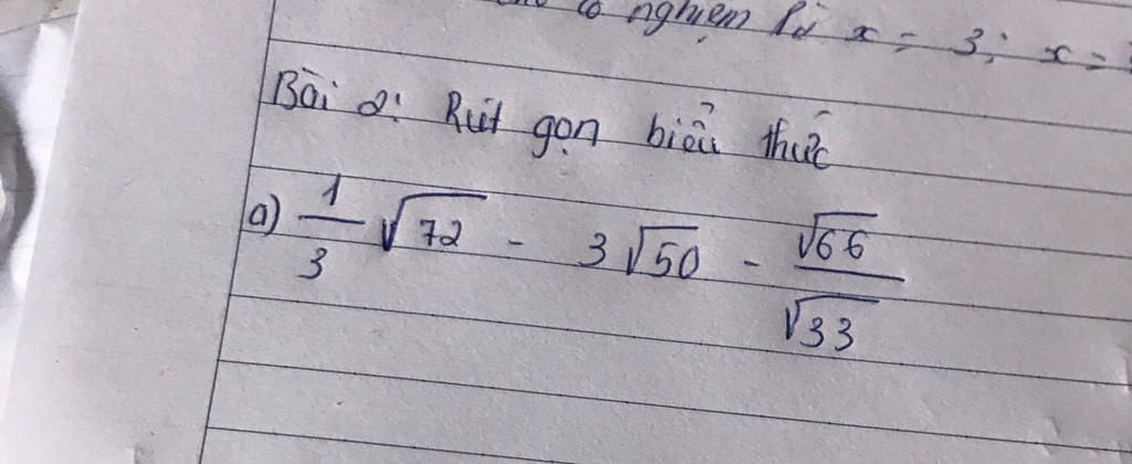 `1/3\sqrt{72}-3\sqrt{50}-(\sqrt{66})/(\sqrt{33})`