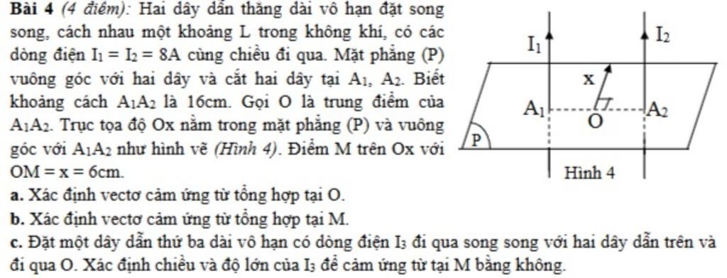 c) Để cảm ứng từ tại M = 0 thì I3 có chiều ngược chiều I1 và I2