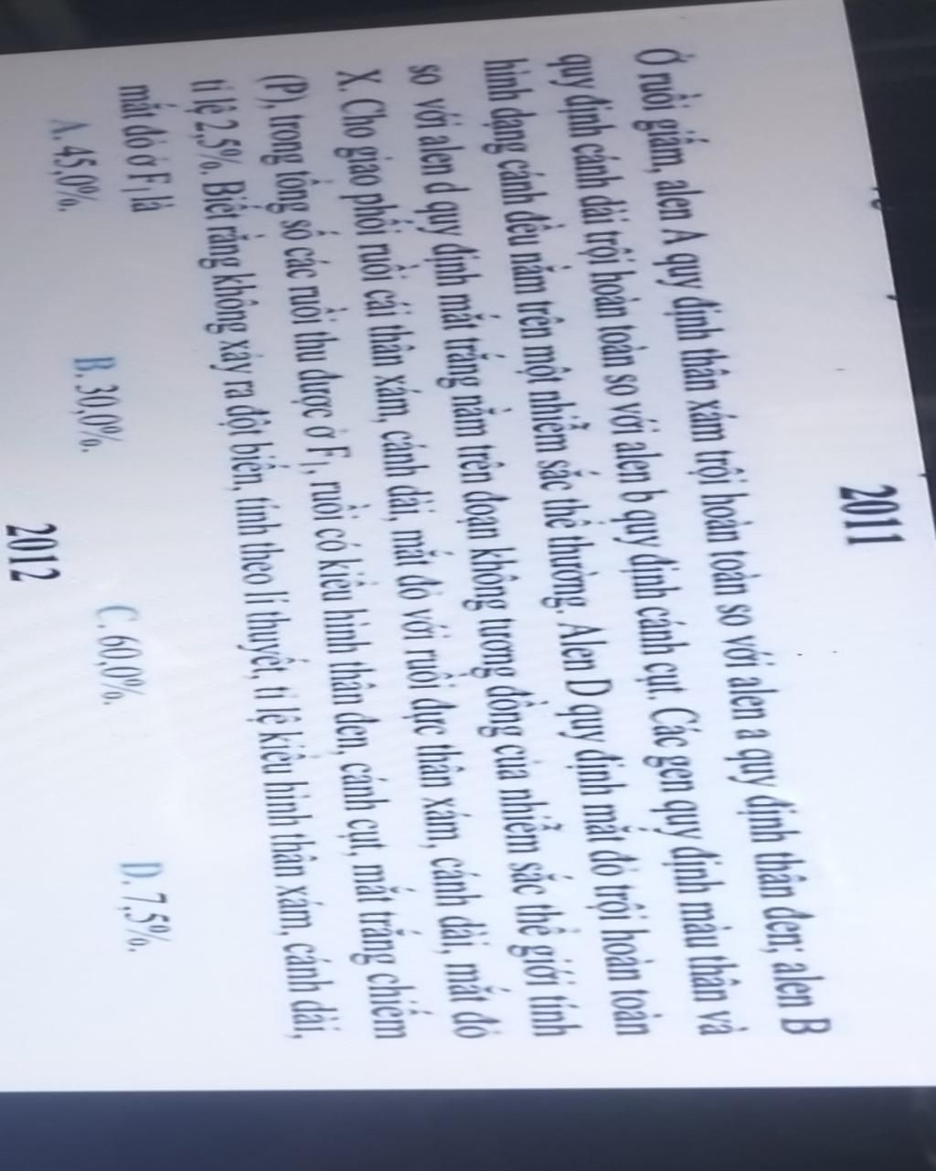 hình dạng cánh đều nằm trên một nhiễm sắc thể thường. Alen D quy định mắt đỏ trội hoàn toàn
