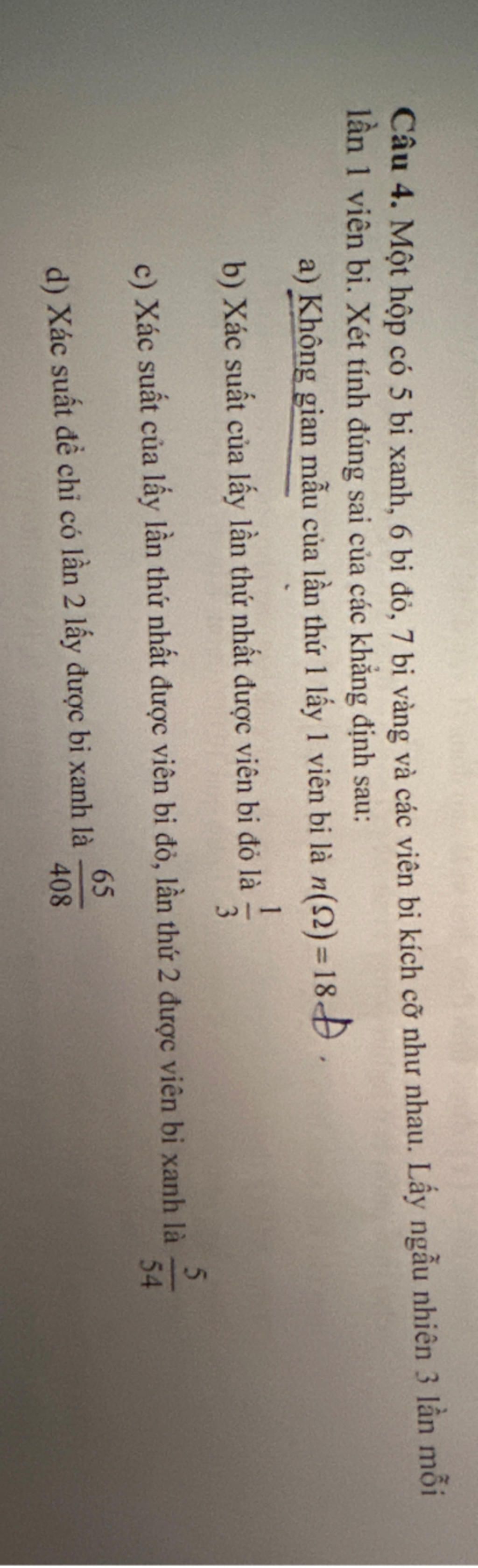 a) Không gian mẫu của lần thứ 1 lấy 1 viên bị là n(2)=18.Đ.