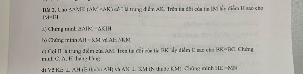 =>ah=km(hai góc tương ứng)góc ahi=góc imk(2 góc tươn ứng)=>ah song song km