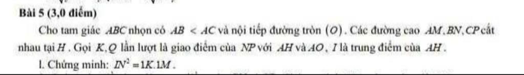 tam giác ABC nhọn có 4B < AC và nội tiếp đường tròn (O). Các đường cao AM, BN,CP cắt