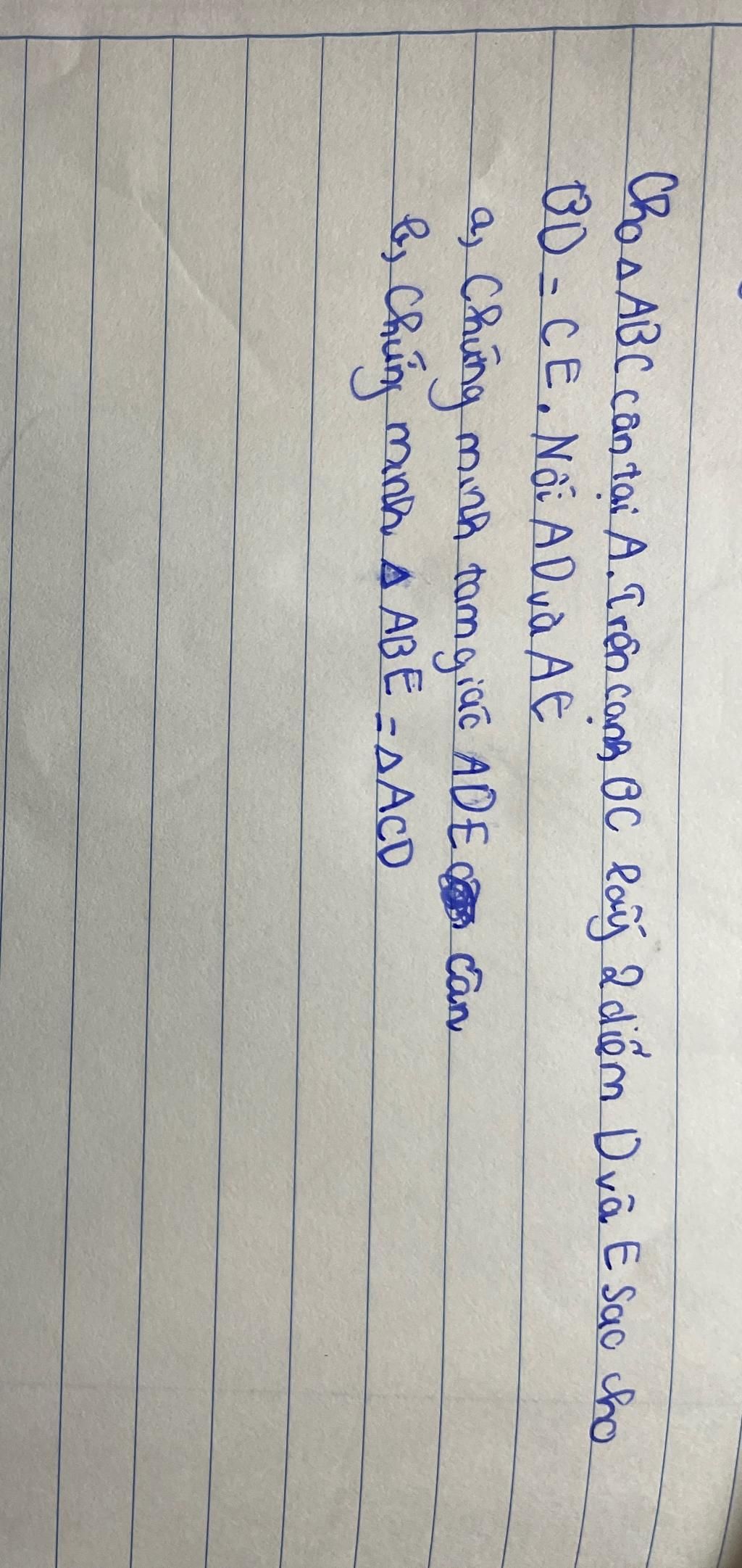 Mà `BD = CE (Delta ADB = Delta AEC)`; `DE` chung
