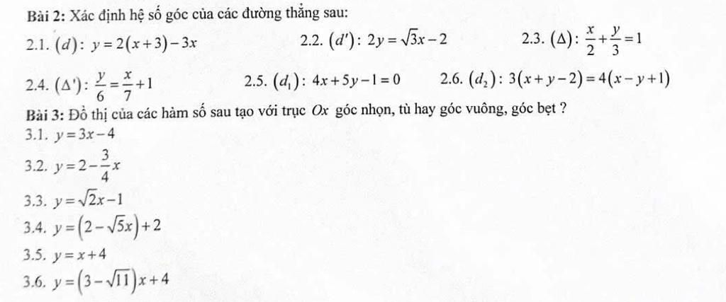 3.4. `y = (2 - \sqrt{5})x + 2` có `a = 2 - \sqrt{5} < 0` (vì `2 = \sqrt{4} < \sqrt{5}`) `\Rightarrow` Góc tù.