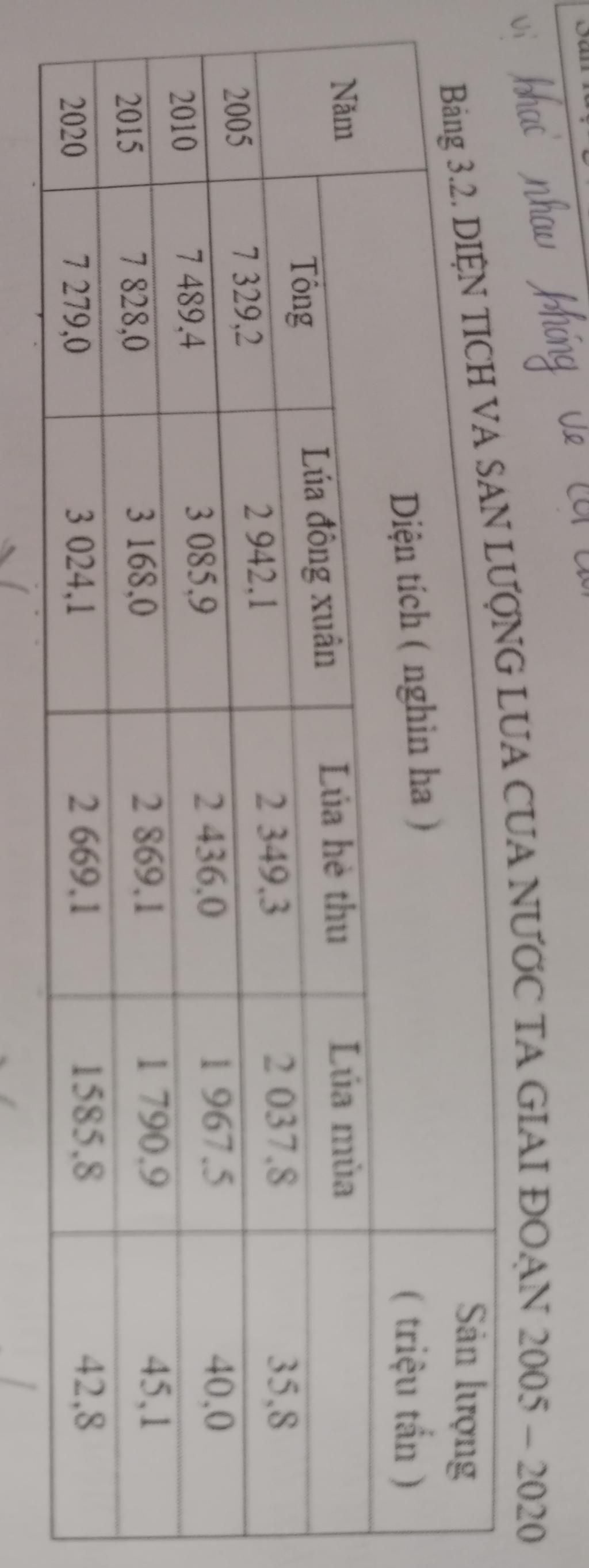 Bảng 3.2. DIỆN TÍCH VÀ SẢN LƯỢNG LUA CỦA NƯỚC TA GIAI ĐOẠN 2005 – 2020