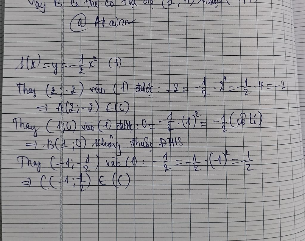 Cho hàm số y=f(x)=`-1/2x^2` có đồ thị (C). Trong các điểm A(2;-2), B(1;0), C(-1;`-1/2), điểm nào thuộc đồ thị (C), điểm nào không thuộc, vì sao?