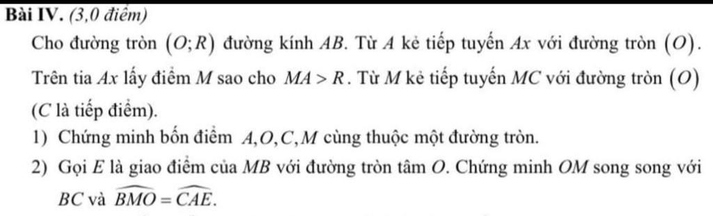`⇒ 4` điểm `A, O, C, M` cùng thuộc 1 đường tròn