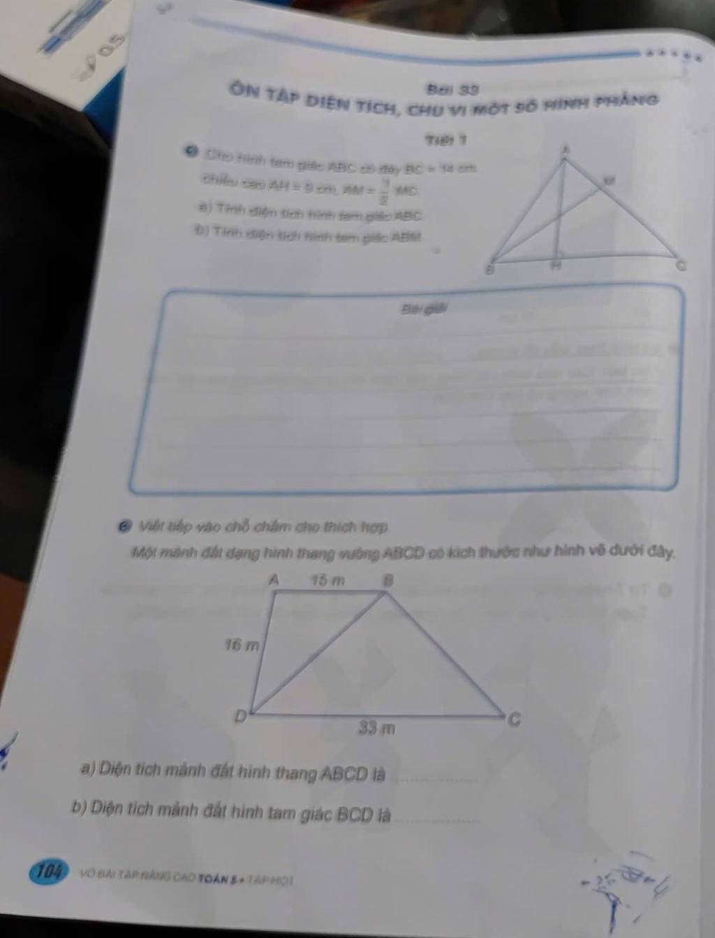 Suy ra `S_{ABM} = 1/3 . S_{ABC} = 1/3 xx 63 = 21(cm^2)`