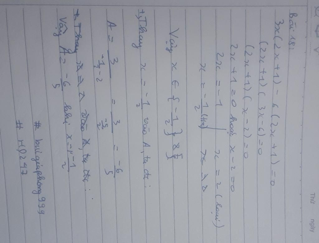 b) Tính gtri của A khi : 3x(2x+1)-6(2x+1)=0