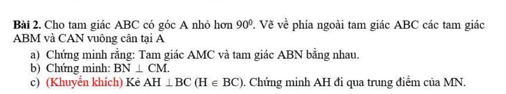 Bài 2. Cho tam giác ABC có góc A nhỏ hơn 900. Vẽ về phía ngoài tam giác ABC các tam giác