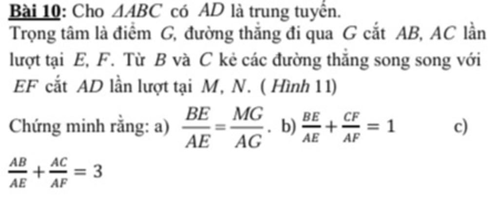 Suy ra:`(AB)/(AE)=(AM)/(AG)`(định lí Thalès)