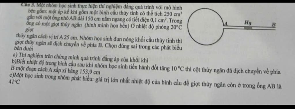Câu 5. Một nhóm học sinh thực hiện thí nghiệm đẳng quá trình với mô hình