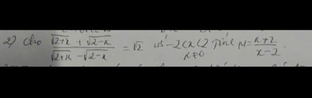 `\frac{\sqrt{2+x} + \sqrt{2-x}}{\sqrt{2+x} - \sqrt{2-x}} = \sqrt{2}`