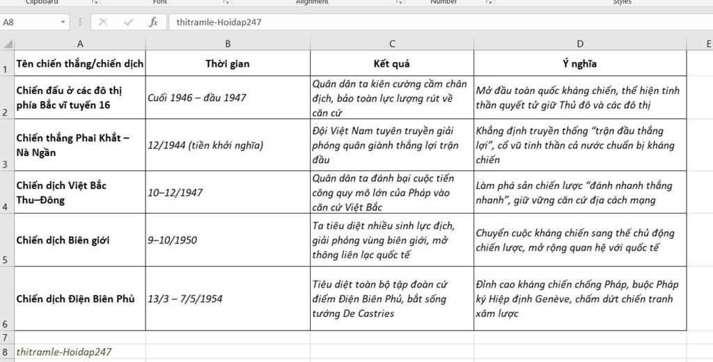 Thống kê các thắng lợi quân sự trong kháng chiến chống pháp ( tên,thời gian,kết quả,ý nghĩa)