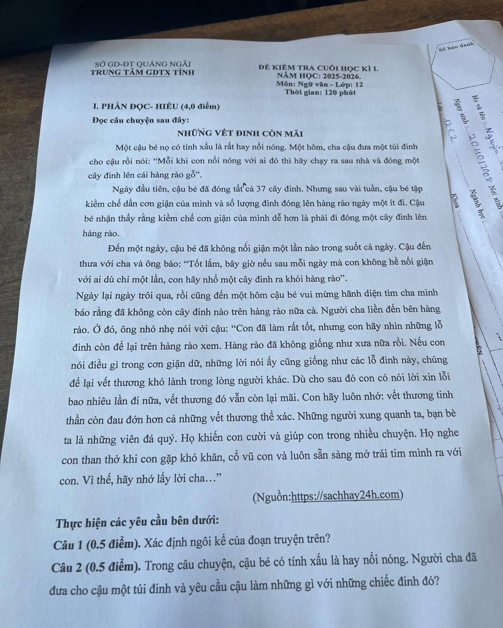 Câu 1: Ngôi kể của đoạn truyện trên là ngôi thứ ba (người kể giấu mình, gọi nhân vật là “cậu bé”, “người cha”)