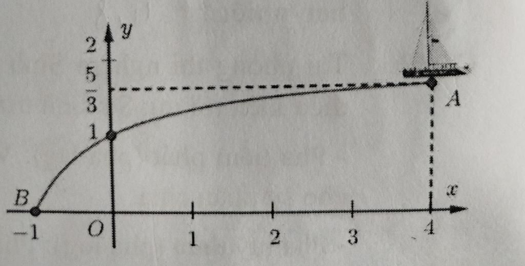 Trong mùa mưa lũ, nước ở trên thượng nguồn đổ dồn về hạ lưu rất mạnh nên thường làm lệch quỹ đạo chuyển động của tàu, thuyền trên sông. Giả sử trong một hệ trục tọa độ Oxy cho trước, một chiếc thuyền $A(4;\dfrac{5}{3})$ đang ở tại điểm A; và chuyển động về phía gốc tọa độ O. Do dòng chảy mạnh nên thuyền di chuyển trên cung đường AB là một phần của đồ thị hàm số $y=(\dfrac{ax+b}{cx+d})$ như hình vẽ, với $B(-1;0)$. Gọi M là một điểm bất kỳ nằm trên cung đường di chuyển của chiếc thuyền. Khoảng cách từ M đến O ngắn nhất bằng bao nhiêu? (làm tròn kết quả đến hàng phần trăm)