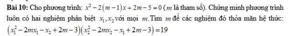 Theo đầu bài :` A = (x_1^2 -2mx_1 + 2m -3)(x_2^2 -2mx_2 +2m -3) =19`
