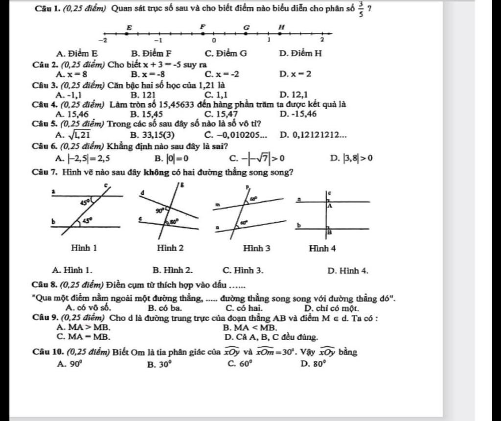 ` *** ` Điểm ` G ` biểu diễn số hữu tỉ ` 3 / 4 ` vì số ` 3 / 4 ` nhỏ hơn ` 0 ` và lớn hơn ` 1 ` mà trong hình chỉ có điểm ` G ` lớn hơn ` 0 ` và nhỏ hơn ` 1 ` .