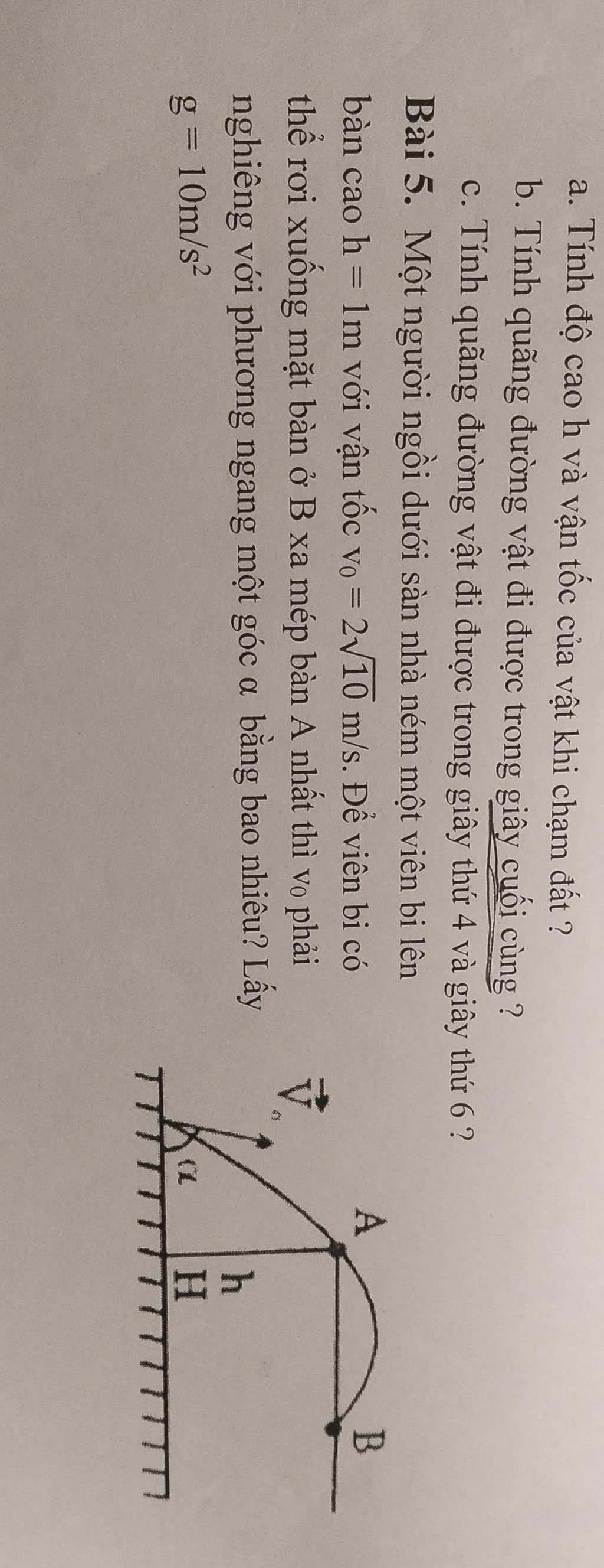 Chạm mặt bàn khi $y=h⇒\dfrac{g}{2}t^2-v_0\text{sin}\ \alpha\ t+h=0$