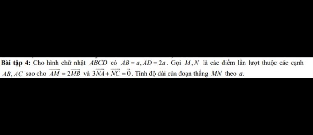 $\Leftrightarrow \overrightarrow{MN} = \overrightarrow{AN} - \overrightarrow{AM} = \dfrac{1}{4}\overrightarrow{AC} - \dfrac{2}{3}\overrightarrow{AB}$