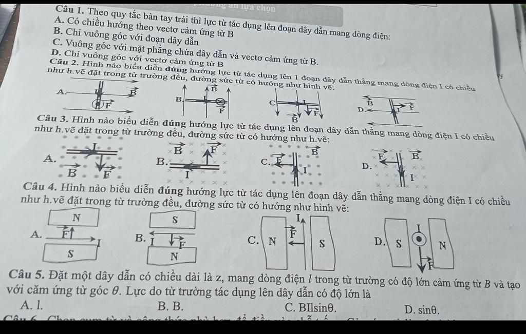 Hình B: `\vec{B}` hướng vào (dấu $\times$) $I$ sang trái ngón cái chỉ lên trên