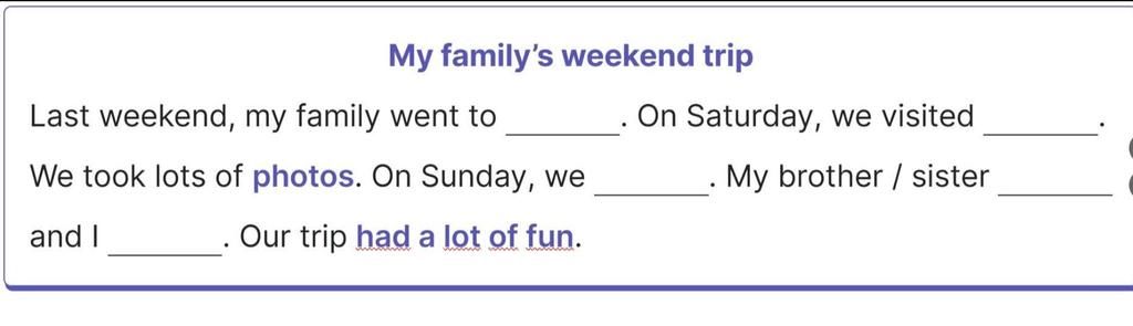 Last weekend,my family went to Thanh Hoa city (tên một địa điểm).On Saturday,we visited Sam Son beach (tên một địa điểm ở nơi nêu trên). We took lots of photos. On Sunday,we played volleyball on the beach(nêu hoạt động đã làm ở đó).My brother/sister and I go swimming(Nếu hoạt động đã làm cùng với anh hoặc chị,em trai hoặc em gái). Our trip had a lot of fun.