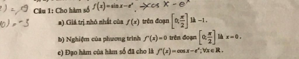 & \text{Giá trị tại } x=0: f(0) = \sin 0 - e^0 = -1 \quad (\text{Là giá trị LỚN nhất}) \\