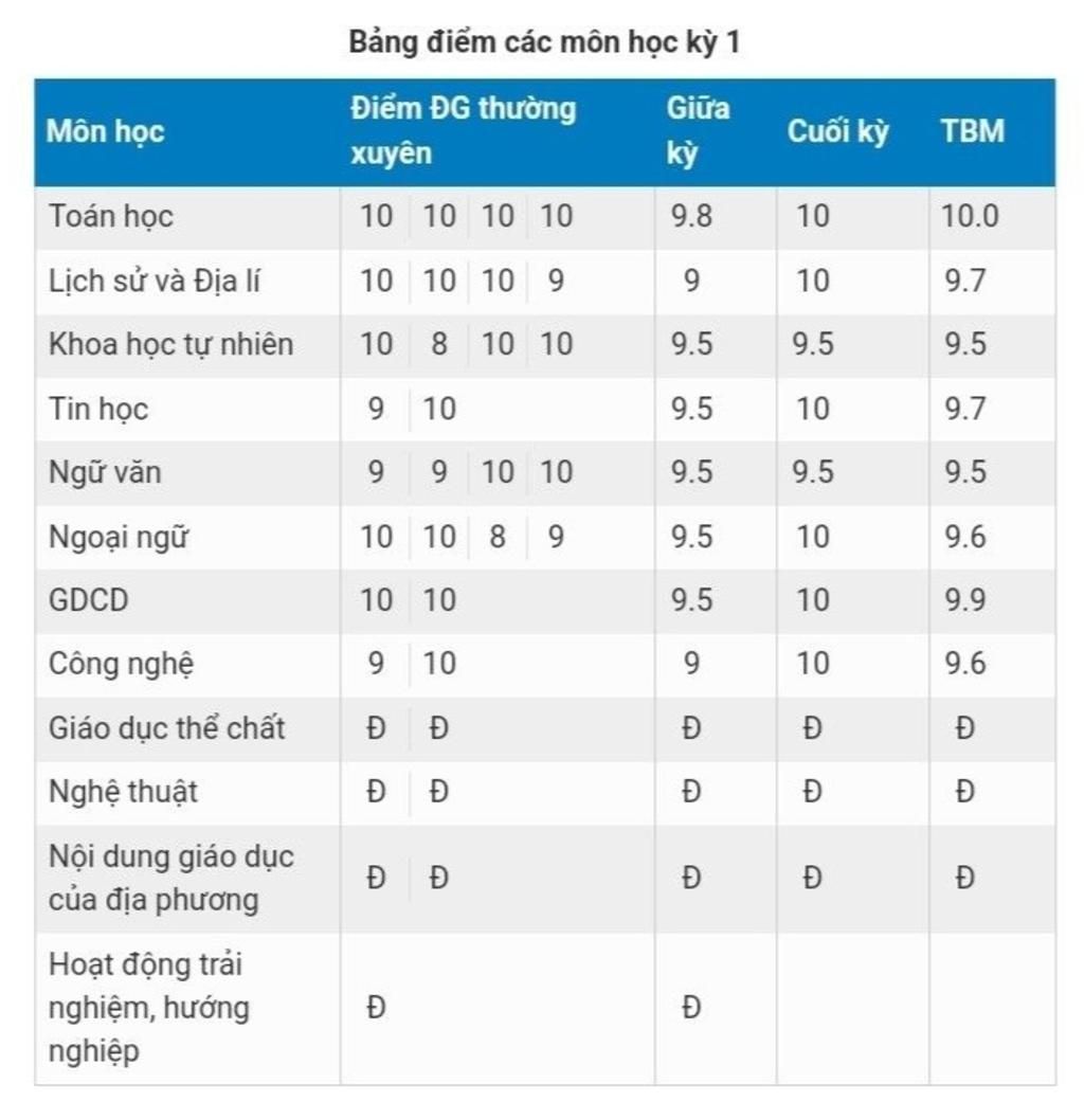 Bảng điểm các môn học kỳ 1