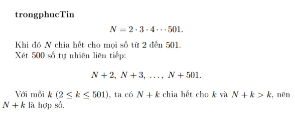 Vậy trong tập hợp số tự nhiên có thể tìm được `500` số tự nhiên liên tiếp đều là hợp số.