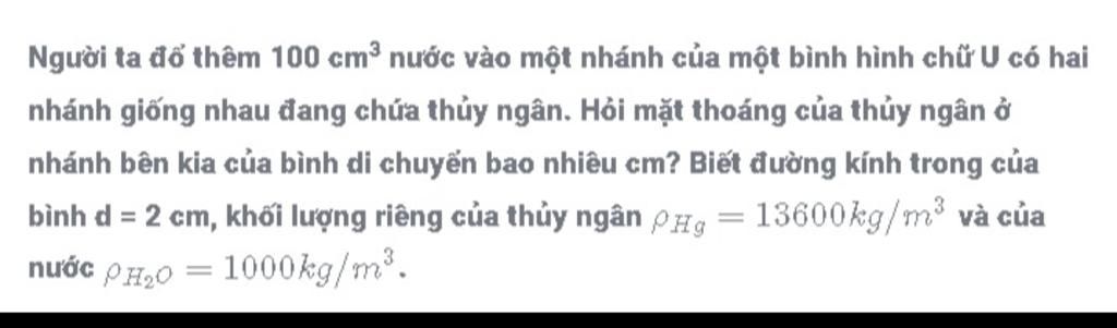 Gọi mực Hg ở nhánh không đổ nước dâng lên $x\ \text{(cm)}$ thì nhánh kia hạ xuống $x\ \text{(cm)}$
