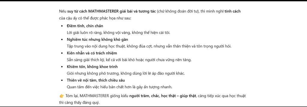 Nếu suy từ cách MATHMASTERER giải bài và tương tác (chứ không đoán đời tư), thì mình nghĩ tính cách