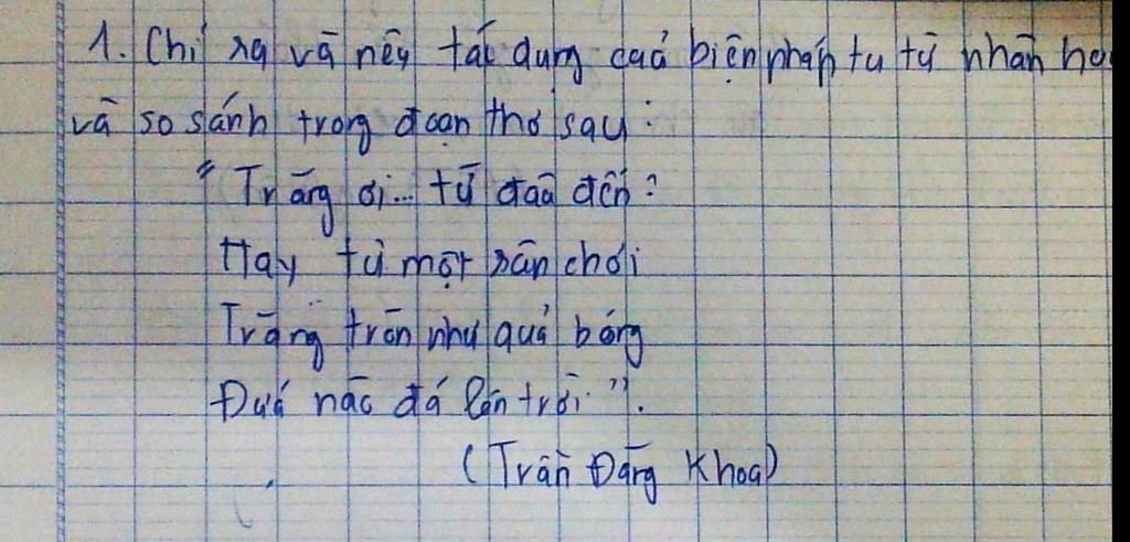 Nhân hóa: “Trăng ơi”, “từ đâu đến”, “hay từ một sân chơi”, “đến nào đi lối”. Tác giả gọi trăng như gọi một người bạn, gán cho trăng hành động, suy nghĩ của con người. So sánh: “Trăng tròn như quả bóng” – so sánh hình ảnh mặt trăng với quả bóng.