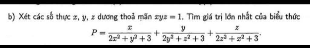 Vậy `P_{max} = 1/2` khi `x =y = z = 1`